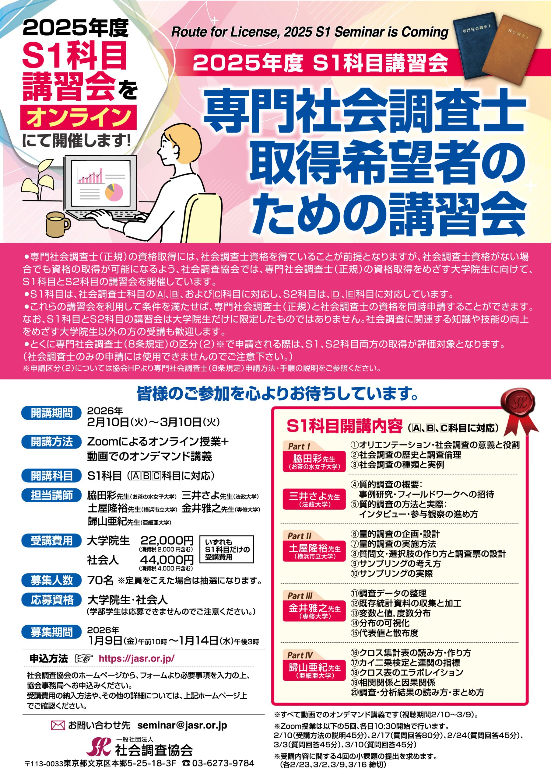 | 2025年度S1科目講習会 | 2026年2月10日~3月10日 | オンライン開催 |